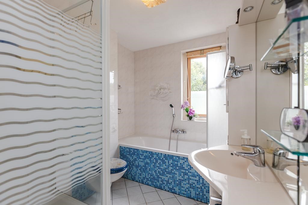 Overloop met toegang tot drie goed bemeten slaapkamers en de badkamer. De gehele verdieping is afgewerkt met een marmerlook vloer. De badkamer is uitgerust met een douchecabine, ligbad, badkamermeubel, inbouwspots, spiegel en zwevend toilet, en is volledig betegeld in een lichte kleurstelling.